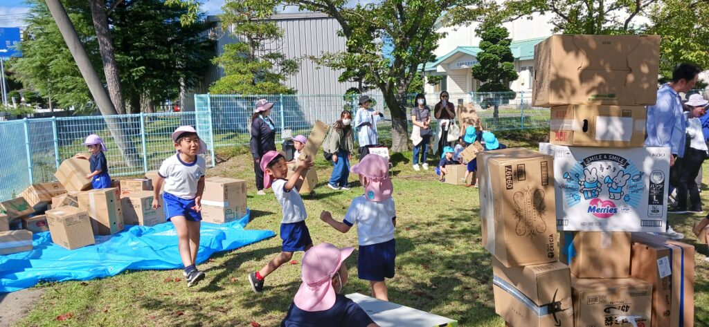 段ボールつみつみ・なわとび・玉入れ・大玉転がし・つなひきと様々なコーナーをお家の人と一緒に回りました。