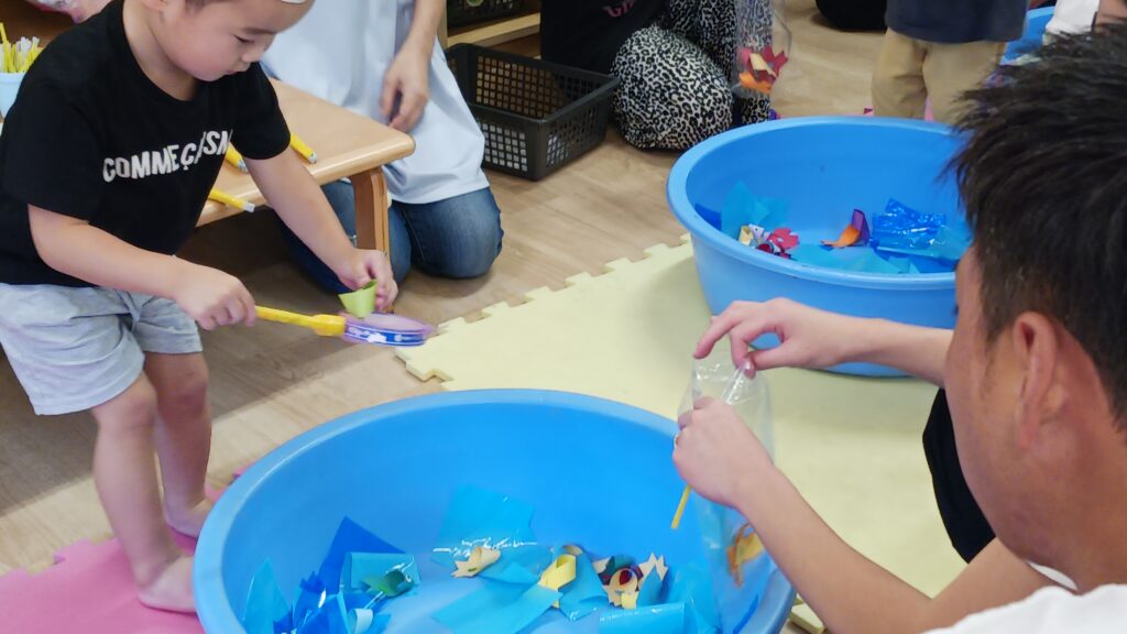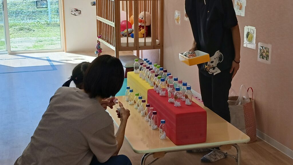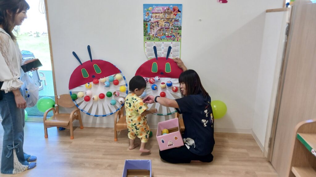 だいち組さんでは「アンパンマンの宝探しゲーム」、きのみ組さんでは「はらぺこあおむしと遊ぼう」、ふたば組さんでは「おまつり屋台」のコーナーが準備され、好きなコーナーをおうちの人と一緒に楽しみました♫