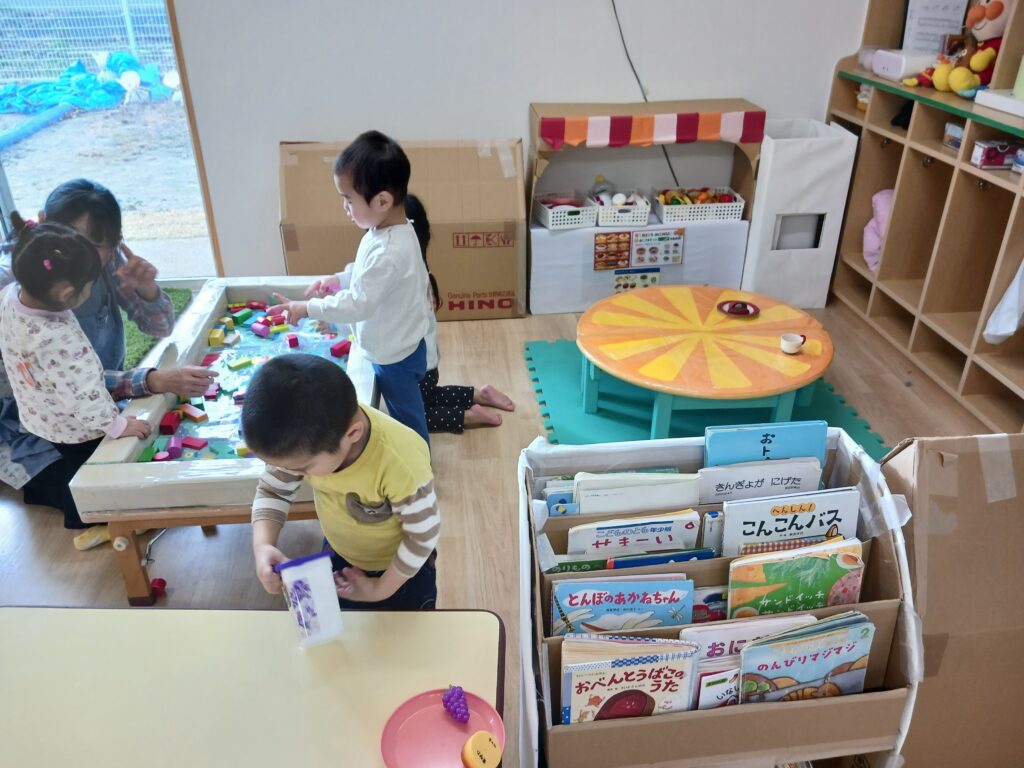 きのみ組とふたば組のお部屋の扉を開放し、好きな遊びを自由に楽しむことができる時間を作っています。ままごとコーナーや絵本コーナー、ブロックに車遊びなど、両方のお部屋にある遊びでも隣のお部屋は魅力的⁈自分のお部屋ではない「隣のお部屋」で遊ぶお友達が多いようです😊