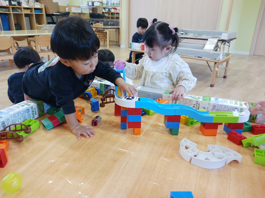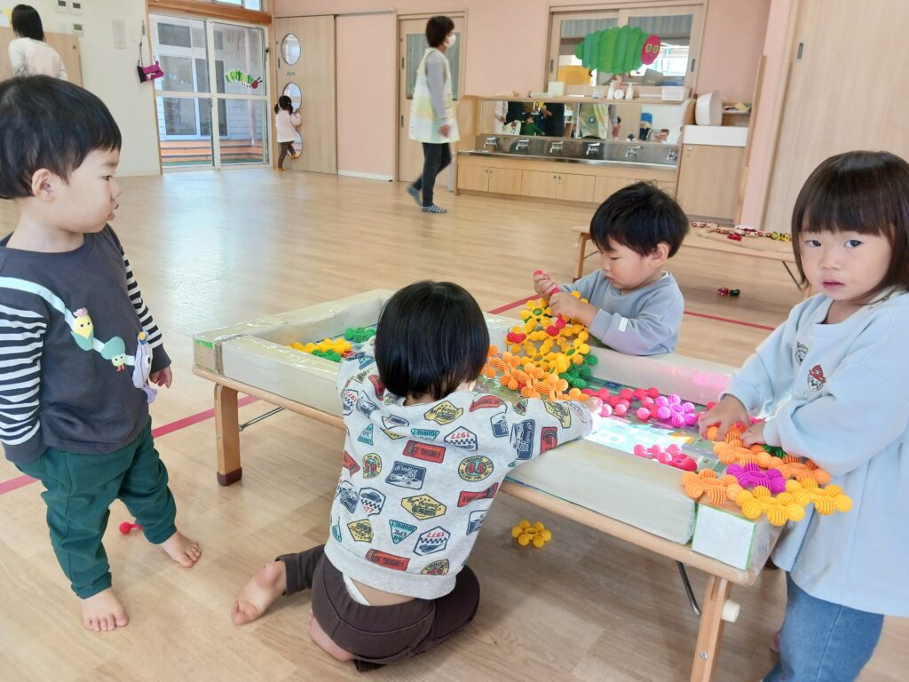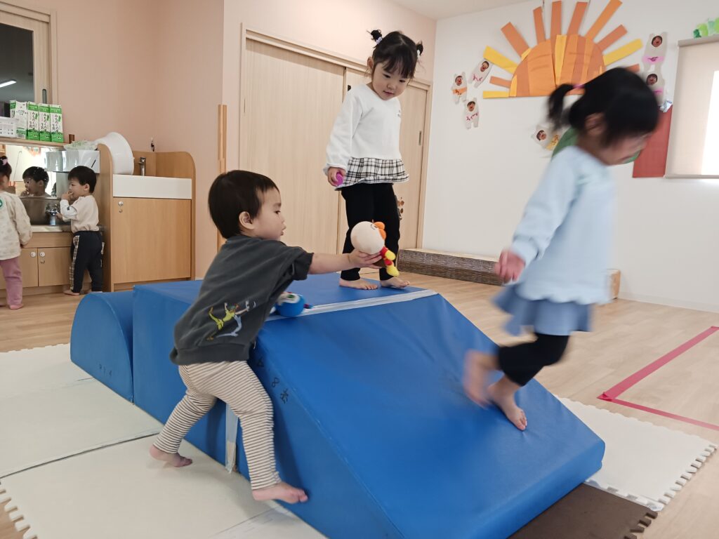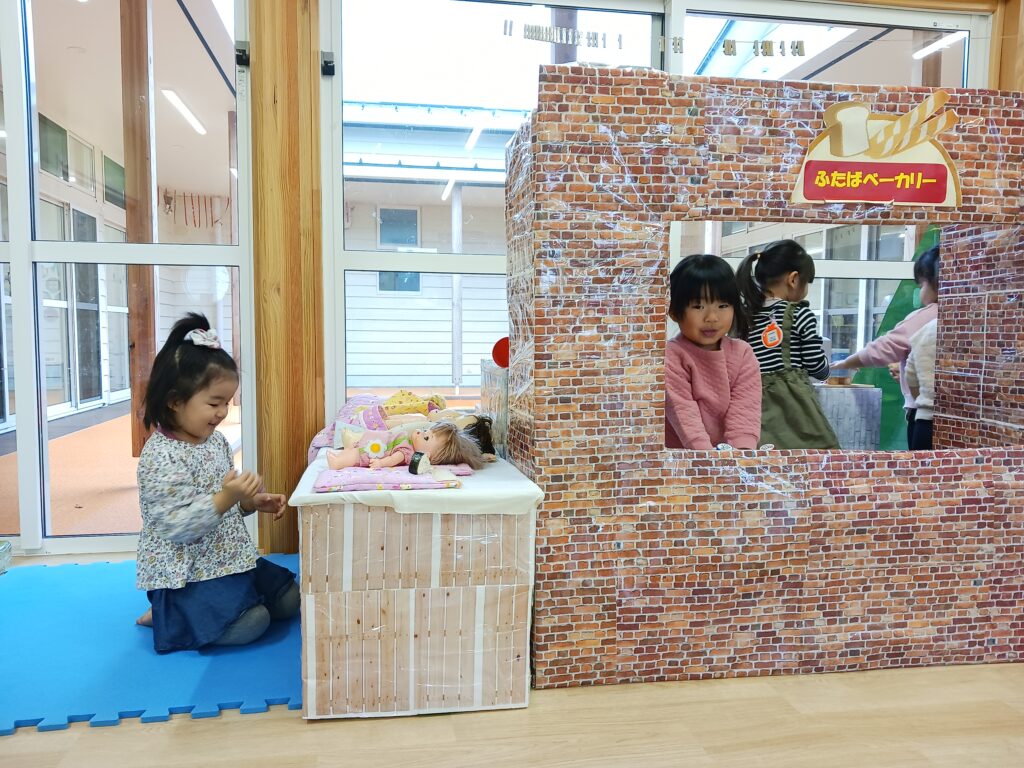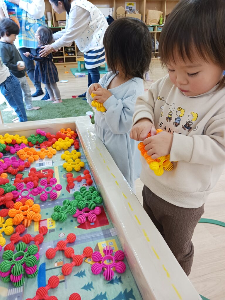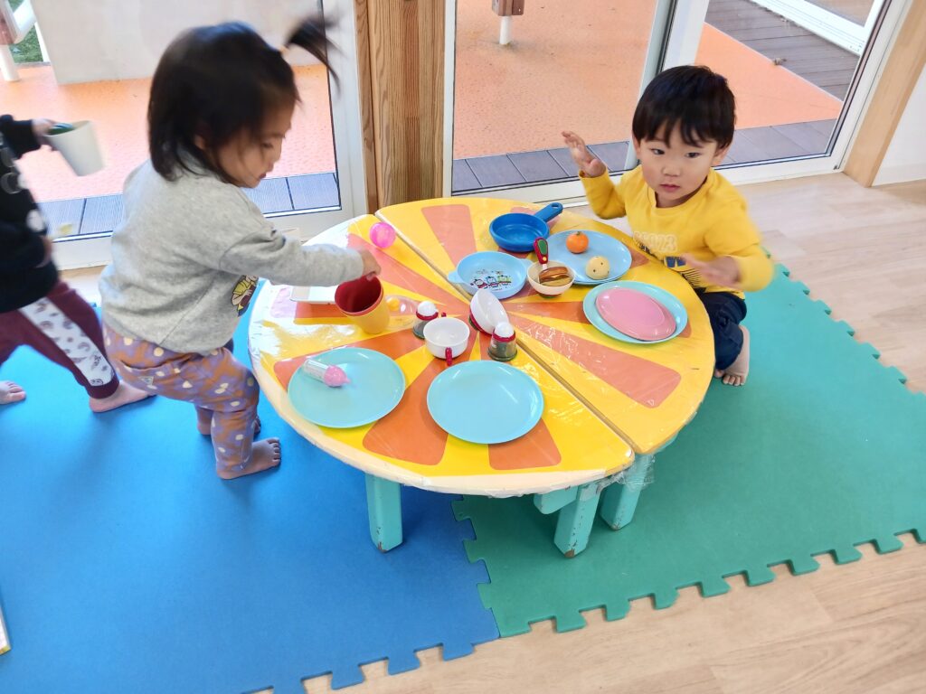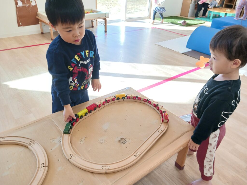 また、1つ年上のお兄さん、お姉さんの姿を見て、真似をして遊んでいるお友達もよく見かけます。お兄さん、お姉さん達も「貸してあげる~」と自分が使っていた玩具を優しく渡していたり、「おいでよー」と遊びに誘ってくれたり、微笑ましい光景がたくさん見られます💖