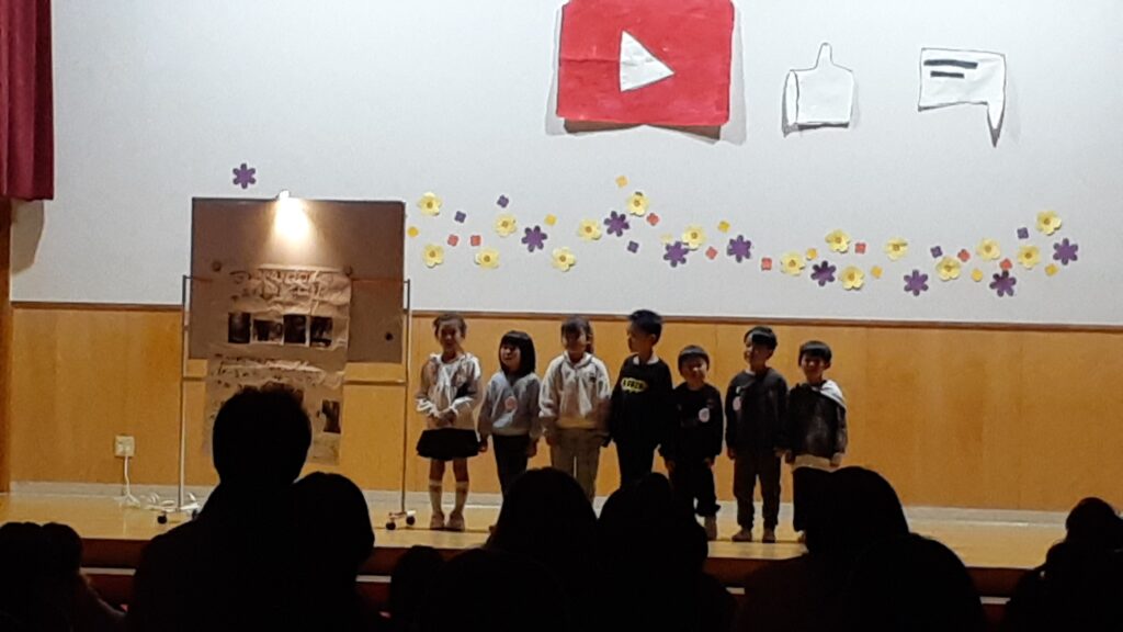きりん組さん、らいおん組さんは、興味のあることや遊びの中で学んだことをYouTubeのように発表しました。