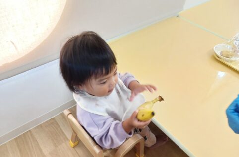 だいち組さん(0歳児)がバナナに触れる体験をしました。 普段、お部屋にバナナの写真を貼っていたり、給食やおやつでバナナを食べたりしていましたが、 今回は1本の皮がついた状態のバナナに触れてみました。 バナナを見せると、手...
